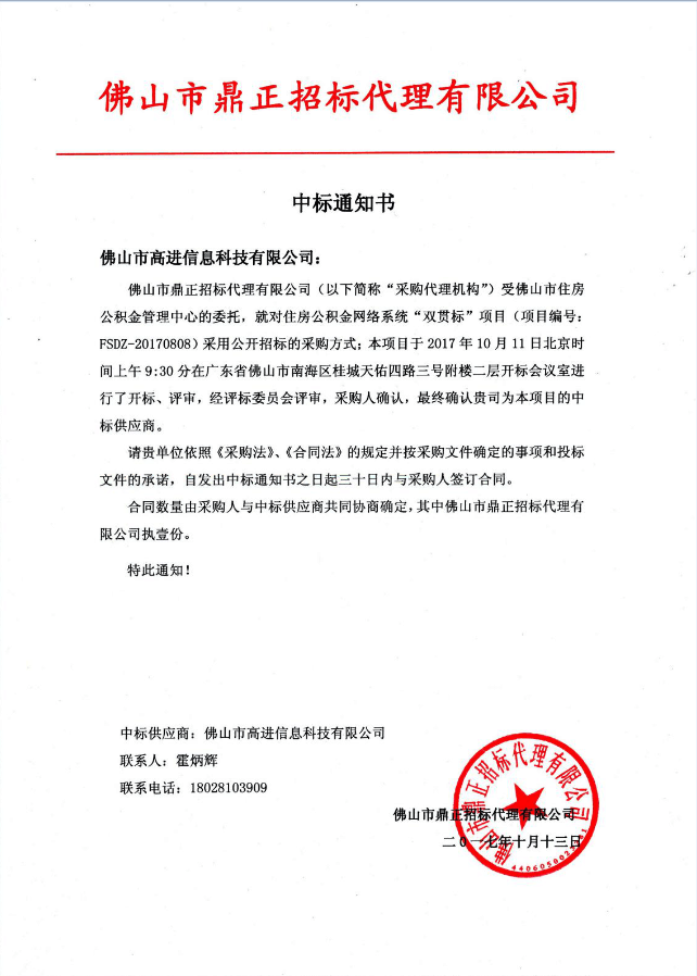 近日,我司經(jīng)過(guò)與多家實(shí)力雄厚的單位激烈競(jìng)標(biāo),于2017年10月13日成功中標(biāo)佛山市住房公積金管理中心住房公積金網(wǎng)絡(luò)系統(tǒng)“雙貫標(biāo)”項(xiàng)目。過(guò)硬的資質(zhì)、雄厚的技術(shù)實(shí)力、合理的價(jià)格、誠(chéng)實(shí)守信的經(jīng)營(yíng)方式、完善的服務(wù)體系是我們勝出的理由。