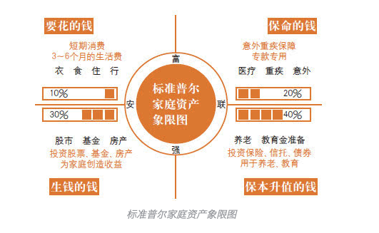 “標(biāo)準(zhǔn)普爾家庭資產(chǎn)象限圖”把家庭資產(chǎn)分成四個(gè)賬戶,這四個(gè)賬戶作用不同,所以資金的投資渠道也各不相同。只有擁有這四個(gè)賬戶,并且按照固定合理的比例進(jìn)行分配才能保證家庭資產(chǎn)長(zhǎng)期、持續(xù)、穩(wěn)健的增長(zhǎng)。
